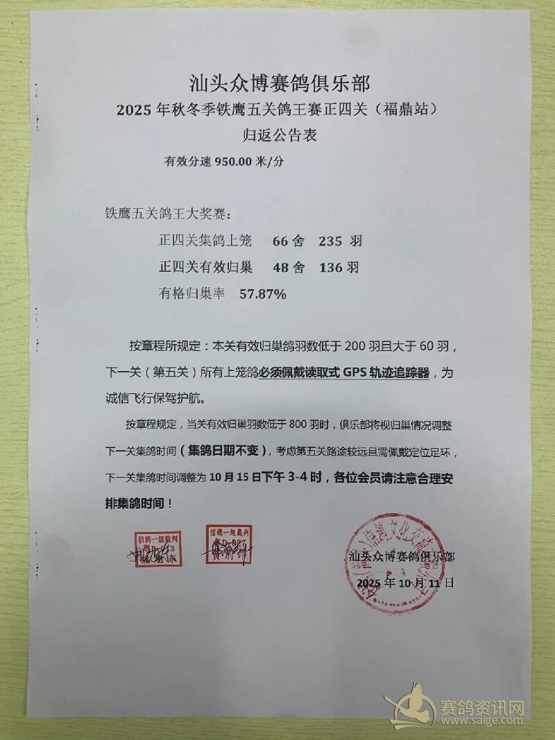 眾博2025年秋冬季鐵鷹五關(guān)鴿王賽正四關(guān)(福鼎)成績校對!!及前四關(guān)綜合排名