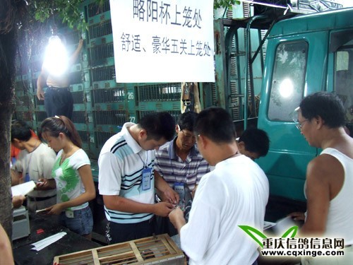 驕陽似火的重慶,信鴿賽事如火如茶!敖鹎锖缽姟北;“略陽”杯搞得熱火熱潮。2006年8月4日19時30分開始,在公平、公正、公開的賽事宗旨指導(dǎo)下,真是人氣旺,獎金高,含金量重。其集鴿情況和現(xiàn)場集鴿圖(轉(zhuǎn))如下: